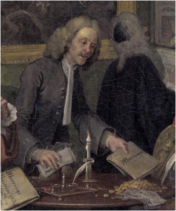 Төлөх өр: Нягтлан нь Үрэн-Таран гүнд шинэ харш бариулсантай холбоотой байж болох төлөх өрийн төлбөрүүд гардуулж байна. Төлөх өрийн бичгийг гэрлэлтийн гэрээтэй хамт харуулснаар Хогарт хоёр эцгийн хоорондох наймааг тун ч ёжтой харуулжээ.