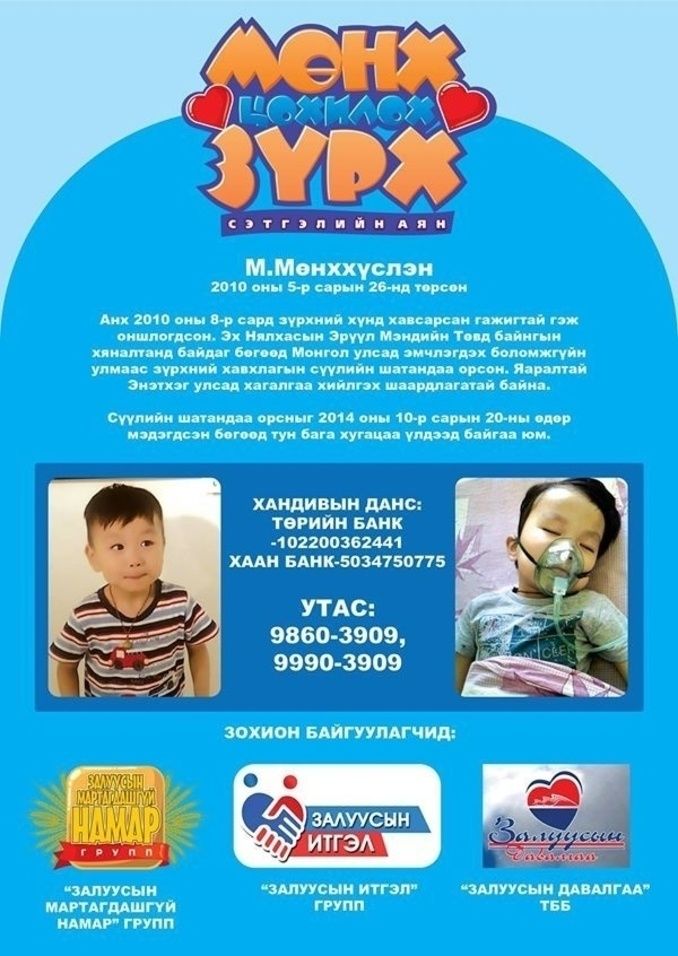 Халуун сэтгэлт монгол түмнээсээ тусламж хүсч, сэтгэлийн аянд нэгдэн, М.Мөнххүслэн хүүд амьдрал бэлэглэхэд туслахыг хүсч байна. Тоглолт өнөөдөр буюу 14-ний 19.00 цагт Тусгаар тогтнолын ордонд болох аж.