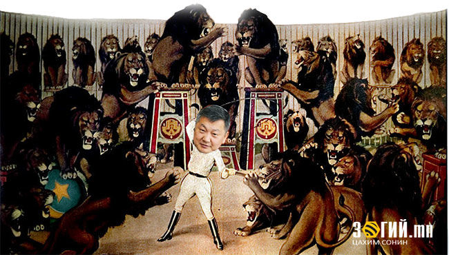 УИХ-ын танхим, улсын циркийн манеж хоёулаа дугуй хэлбэртэй, сургуультай амьтан, алиалагч, илбэчин, иогчин, хүчтэн бүгд бий. З.Энхболд бээр олонхигүй, олон янзын ууртай арслангуудын учрыг олж, ирцийг нь бүрдүүлэх хүнд хөдөлмөр эрхэлж байна.