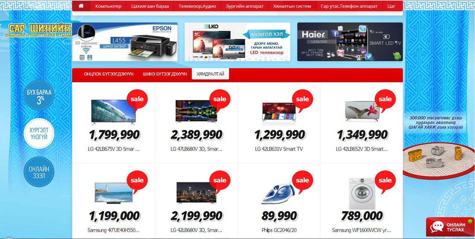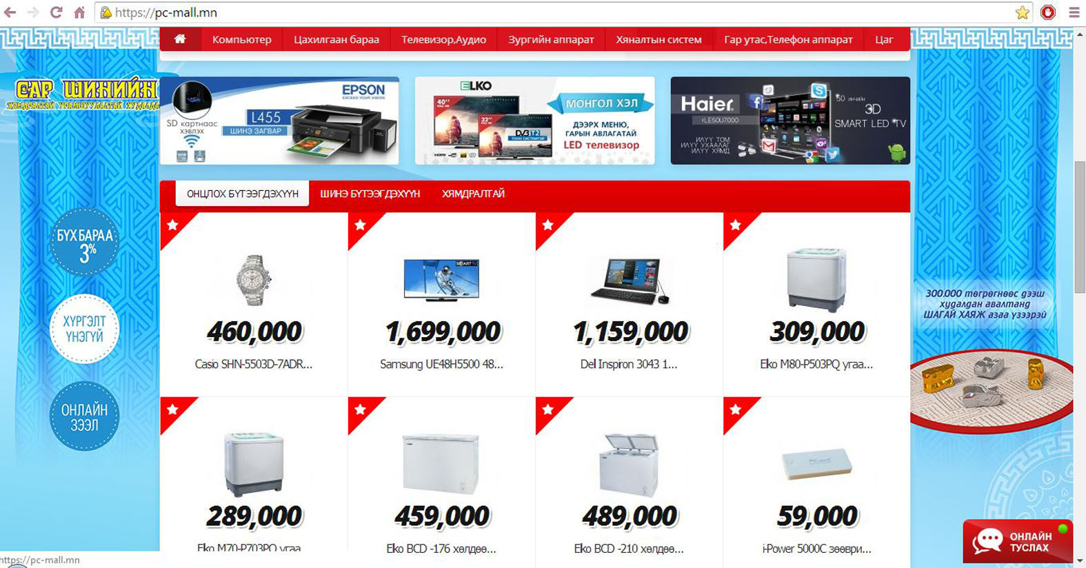 Яагаад гэвэл онлайн худалдаа бусдаас хямд бас хамгийн шуурхай байж танд сэтгэл ханамжийн баталгаа өгнө. PC-Mall.mn онлайн худалдаанаас та Samsung, Sharp, Haier, Elko, Bosch, LG брэндийн гэр ахуйн цахилгаан бараа болон PC mall дэлгүүрээр зарагдаж байгаа бүх барааг хямдарсан үнээс дахин 3% хямдруулж аваарай.