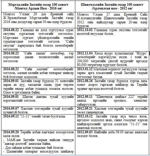 Мөн өмнөх дөрвөн жилийн Засгийн газар 100 хоногт ямар ажлууд хийснийг одоогийн Засгийн газрын 100 хоногт хийсэн ажилтай харьцуулжээ.