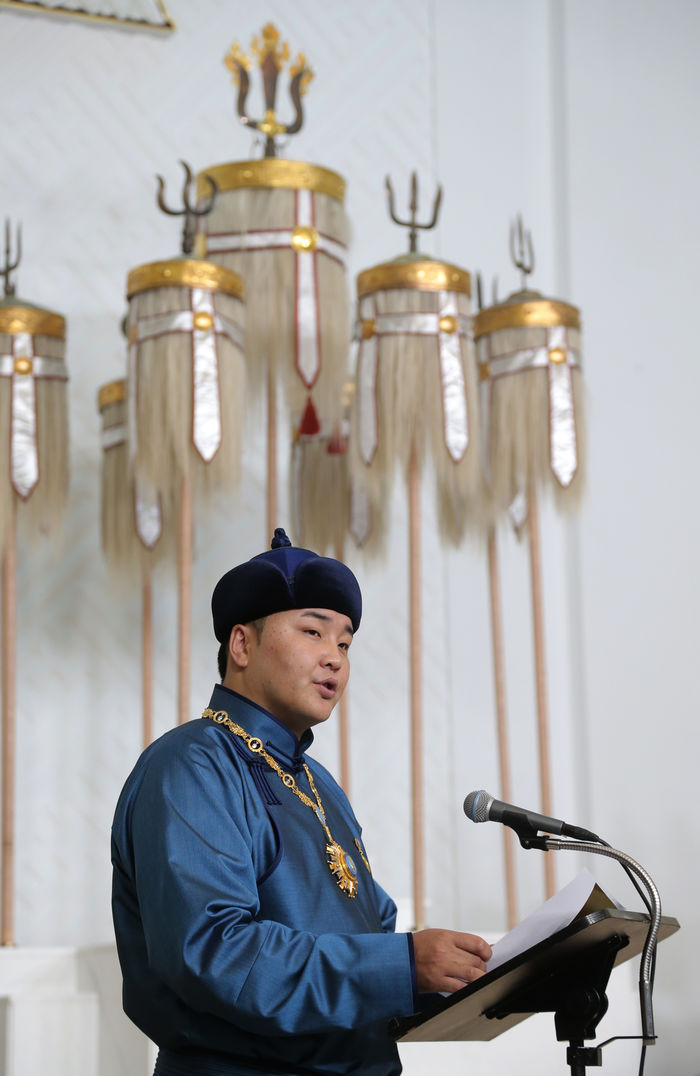 Та бүхэндээ монголчуудын дээд шүтээн Их эзэн Чингис хааныхаа мэндэлсэн өлзийт өдөр- Монгол бахархлын өдрийн баярын мэндийг хүргэе. Энэ баярт өдөр намайг Монгол Улсын төрийн эрхэм дээд шагнал, тэргүүн зэргийн “Чингис хаан” одонгоор шагнаж буйг гүн хүндэтгэлтэй, нэн баяртайгаар хүлээн авч байгаагаа илэрхийлье.