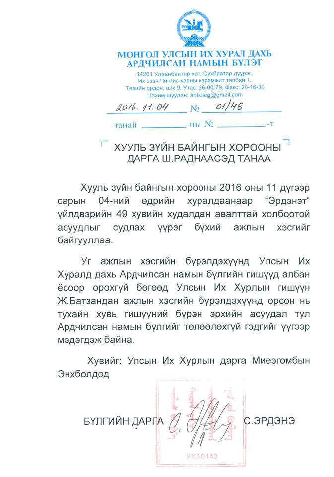 УИХ дахь Ардчилсан намын бүлгээс мэдэгдэл гаргажээ. Тус мэдэгдэлдээ ""Эрдэнэт" үйлдвэрийн 49 хувийн худалдан авалттай холбоотой асуудлыг судлах ажлын хэсэгт УИХ дахь Ардчилсан намын бүлгээс албан ёсоор орохгүй бөгөөд УИХ-ын гишүүн Ж.Батзандан ажлын хэсгийн бүрэлдэхүүнд орсон нь тухайн хувь гишүүний бүрэн эрхийн асуудал тул Ардчилсан намын бүлгийг төлөөлөхгүй" хэмээжээ.