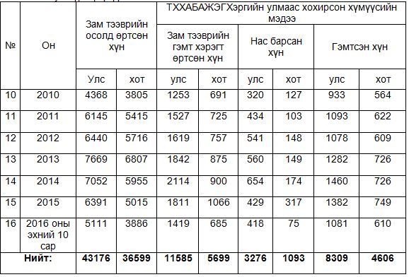 Монгол улсад 2010-2016 оны байдлаар 43176 хүн зам тээврийн осолд өртсөнөөс тээврийн хэрэгслийн хөдөлгөөний аюулгүй байдал, ашиглалтын журмын эсрэг гэмт хэргийн улмаас 3356 хүн амь насаа алдаж, 8309 хүн хүнд, хүндэвтэр гэмтлийг авсан байна.