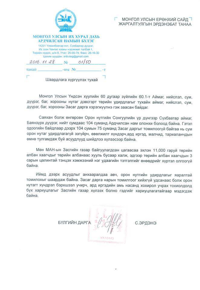 Тиймээс энэ хоёр асуудлыг яаралтай шийдэхийг Засгийн газрын тэргүүнээс шаардсан байна. Орон нутаг удирдлагагүй байснаас гарах аливаа хүндрэл, бэрхшээлийн хариуцлагыг Засгийн газар хүлээх ёстой хэмээн АН-ын бүлэг үзжээ.