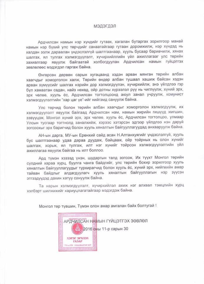 Ардчилсан намын Гүйцэтгэх зөвлөл өчигдрөөс эхлэн хуралдсан Ерөнхий сайд асан Н.Алтанхуягийн асуудлаар хэлэлцсэн юм. Тэгвэл өнөөдөр албан ёсоор мэдэгдэл гаргалаа. Ардчилсан намын энэхүү мэдэгдэлд "энэ бүх хэлмэгдүүлэлт, хүчирхийлэл ахиж нэг алхавал тэмцлийн хурц хэлбэрт шилжинэ" гэдгийг онцолжээ.