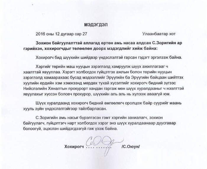 Тэгвэл С.Зориг агсны дүү УИХ, ЗГ-ын гишүүн асан С.Оюун өчигдрийн шүүх хурлын дараа ийм мэдэгдэл гаргажээ.