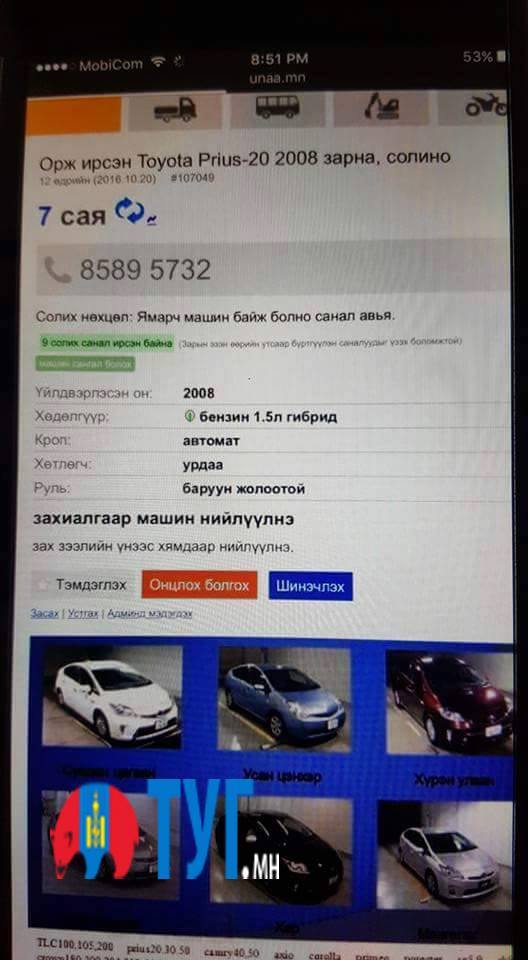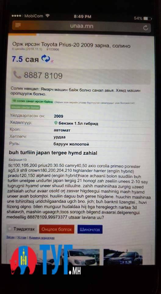 Хохирогч А.Гэрэл-Од: Unaa.mn сайтаас тус компаний зарыг хараад найман сая төгрөгийн приус 20 маркийн машин захиалахаар ах дүү, хамаатнуудаасаа дөрвөн сая 500 мянган төгрөг цуглуулж урьдчилгаагаа бэлнээр нь өгсөн. Тухайн үед надтай тус компаний нягтлан Ч.Уянга гэх эмэгтэй уулзаж 11-р сарын 28-н гэхэд таны машин гааль дээр буусан байх болно гэж хэлээд салсан. Дунд нь би хоёр удаа утсаар ярихад таны захиалсан машин ачигдсан наашаа явж байгаа гэж хэлээд 11-р сарын 20-ноос хойш утас нь холбогдох боломжгүй болчихсон.Ингээд би 13-р хорооллын дунд зам дагуу байдаг оффис дээр нь очиход хаалга нь хаалттай хажуу оффисийн залуу гарч ирэн наад компани чинь хаагдсан, луйврын хэргээр цагдаад шалгагдаж байгаа, намайг БЗД-ийн цагдаагийн хоёрдугаар хэлтэс дээр очихийг зөвлөж, намайг очиход 50 гаруй хүн хохирсон гомдлоо бичээд үлдээ гэж тус цагдаагийн хэлтсийн мөрдөн байцаагч Анхбаяр гэх хүн хэлээд өнгөрсөн. Одоо хүртэл тэр хүнээс ямар ч сураг байхгүй, шалгаж байна гэхээс өөр ямар ч хариулт өгөхгүй байна.