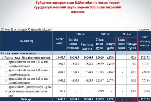 Мөн улсын төсвөөс эргэн төлөглөх нөхцөлтэйгээр есөн чиглэлийн зээл олгожээ. Тухайлбал, автозам, дэд бүтэц, төмөр зам гэх мэт 371 төсөлд 3.2 их наяд төгрөг зарцуулсан.