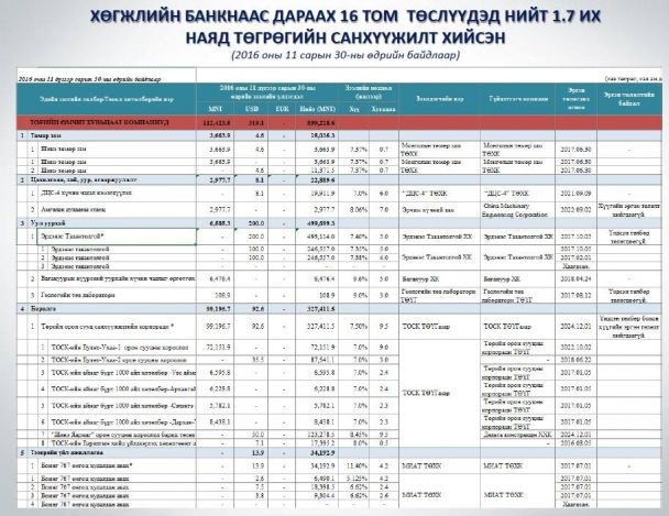 Түүнчлэн 1.7 их наядыг Хөгжлийн банк 16 төсөлд зарцуулахдаа улсын үйлдвэрийн найм, хувийн найман төсөлд зарцуулсан байна.