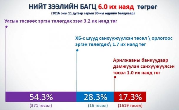 Мөн арилжааны банкуудаар дамжуулан нийт зээлийн 17.3 хувь буюу нэг их наяд төгрөгийг 1619 төсөлд олгожээ.