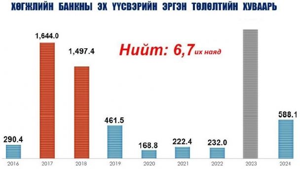 Мөн Хөгжлийн банк 6.9 их наяд төгрөгийн зээл олгосноос 69.6 хувь нь хугацаа хэтэрсэн, 13.8 хувь нь чанаргүй зээл байжээ. Мөн 2017-2019 оны хооронд гаднаас авсан зээлийн эргэн төлөлтөд 3.7 их наядыг төлөх юм байна. Ингэхдээ зээл олгосон аж ахуйн нэгжүүдээс 2.2 их наядыг татан авах ёстой аж.