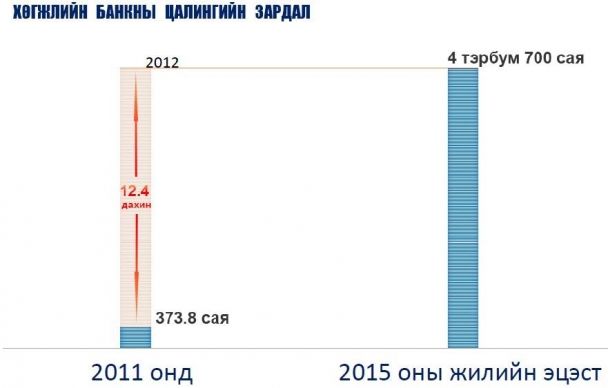 Хөгжлийн банкны албан хаагчдын цалингийн зардал 2011 онд 373.8 сая төгрөг байсан бол 2015 оны жилийн эцсийн байдлаар 4 тэрбум 700 сая төгрөг болж өсчээ.
