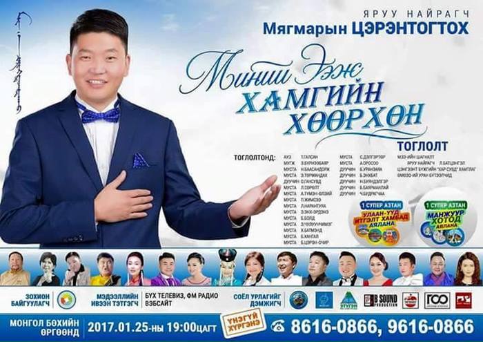 Монгол түмний дунд амнаас ам дамжин, сэтгэлээс сэтгэлд дамжин өртөөлөн эгшиглэж буй уран бүтээл болох дуучин О.Гансувдын дуулсан "Миний ээж хөөрхөн" дууны шүлгийг бичсэн яруу найрагч М.Цэрэнтогтохын "МИНИЙ ЭЭЖ ХАМГИЙН ХӨӨРХӨН" нэртэй анхны уран бүтээлийн тоглолт 2017.01.25 нд 19 цагаас Монгол бөхийн өргөөнд болох юм байна. Тоглолтонд дуучин Э.Төрмандах, О.Гансувд, А.Түмэн-Өлзий, П.Жимсээ, жүжигчин Л.Сөрөлт гээд сүүлийн үеийн нийтийн дууны өнгө төрхийг тодорхойлж буй шилдэн уран бүтээлчид ая дуугаа өргөх юм байна.