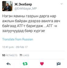 Нэг яамны газрын дарга нар авилга авч байгаад үйлдэл дээрээ баригджээ. Энэ тухай УИХ-ын гишүүн Ж.Энхбаяр өөрийн твиттерээр жиргэсэн байна. Тэрбээр "Нэгэн яамны газрын дарга нар ажлын байран дээрээ авилга авч байгаад баригдаж, АТГ-ын залуучуудад баяр хүргье" гэжээ.