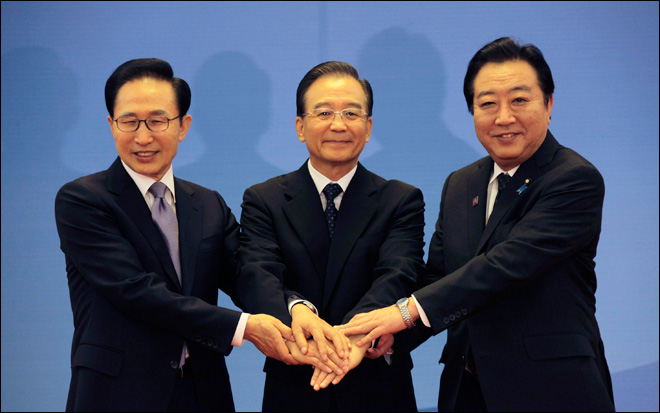 Бээжинд 2012 оны 05 сарын 13-ны өдөр тус гурван улсын тэргүүнүүд уулзаж эдийн засгийн чөлөөт бүс байгуулах ажлыг энэ ондоо багтаан эхлүүлэхээр тохиролцож улмаар худалдааны чөлөөт бүсээс гадна харилцан хөрөнгө оруулах гэрээнд гарын үсэг зуржээ. Энэ гурван улсын 1999-2012 оны хамтран ажилласан байдлын талаар Хятадын Гадаад хэргийн яамнаас гаргасан “Цагаан ном”-д өгүүлснээр тус улсуудын гадаад худалдааны бараа эргэлт 1999 онд 130 тэрбум ам.доллар байсан бол 2011 онд 690 тэрбум болон өссөн байна. Гэтэл харилцан хөрөнгө оруулалт нь гадаад хөрөнгө оруулалтынхаа зургаахан хувийг эзэлж байгаа нь хөрш зэргэлдээ орнуудын хувьд шүүмжлэлтэй асуудал болохыг дурьджээ.Энэхүү хөрш орнуудын удирдагчдын тав дахь удаагийн уулзалтад Өмнөд Солонгосын Ерөнхийлөгч Ли Мен Бак, Японы Ерөнхий сайд Есихико Нода, Хятадын Төрийн Зөвлөлийн Ерөнхий сайд Вэнь Зябао нар оролцж