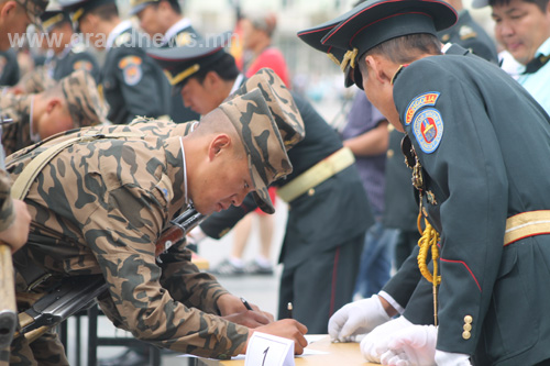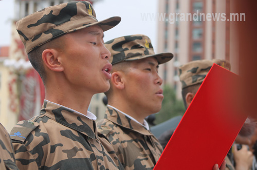 Эх орныхоо төлөө тангараг өргөж байгаа эр цэргүүдийн ар гэрийнхэн хүүгээ харах гэсэн аав ээжүүд нэгэн жигд эгнэн зогссон цэргүүдээс олж чадахгүй энэ тэр биш байна гэж ярилцана. Эгнүүлж тавьсан эрээн бор хувцастайгаа эгнэн зогссон эр цэргүүд маань сүр жавхлантай өнгөлөг харагдаж байна. Бид ийм л эр цэрэгүүдээр эх орноо мануулж байгаа гэж бодохоор бахархмаар байлаа.