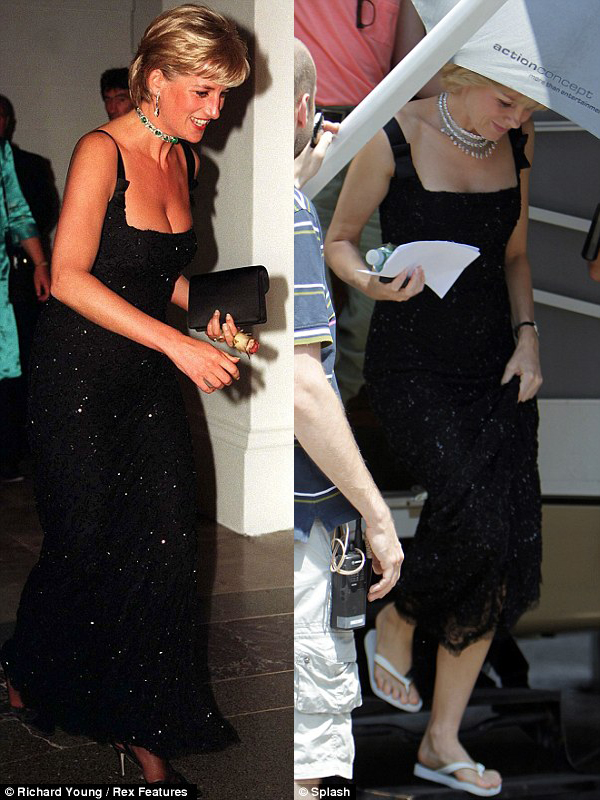 Энэхүү гүн ухлаадас, шал шүргэсэн хормойтой гялалзсан хар даашинз Уэлсийн гүнж Дианагийн хамгийн алдартай хувцас. Диана гүнж 1997 онд төрсөн өдрөөрөө энэ даашинзаар гоёсон юм. Тэгвэл жүжигчин Наоми Ваттс “Caught in the Flight” хэмээх гүнжийн намтар кинонд Дианагийн дүрийг бүтээхдээ өмссөн байгаа нь энэ юм. Тус киноны оройн зоогийн хэсгийг Хорват улсад авах үеэр Англи жүжигчин Наоми гүнжийн дуртай гоёл болох алмазан зүүлт, индранил ээмгийг хослуулжээ. Диана гүнжийн намтар киног Германы Оливер Хиршбиегел найруулж байна. Энэ хүн Адольф Гитлерийн амьдралын хамгийн сүүлийн өдрүүдийг үзүүлсэн Downfall киног найруулж нэрд гарсан юм. Найруулагч Хиршбиегел “Наоми бол үнэхээр ер бусын жүжигчин , түүнд дэлхийн идеал Диана гүнжийн халуун дулаан сэтгэл, энэрэнгүй зан, өөрийгөө бусдын оронд тавьж боддог чадвар зэрэг бүгд бий” гэжээ. “Caught in the Flight” кинонд 1997 онд автын осолд орж, амь үрэгдэх үе хүртэлх Диана гүнжийн сүүлийн хоёр жилийн амьдралыг үзүүлэх юм.