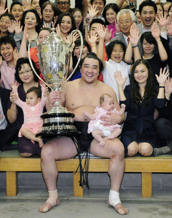 Мэргэжлийн сумогийн дэвжээг эзэгнэнэн төрөгсдийн нэг Харумафүжи Д.Бямбадорж Монголын гурав дахь сумоч ёкозуна цолтон боллоо. Башёгийн сүүлийн өдөр уран, дайчин, ухаалаг барилдаанаар их аварга Хакухог давснаар 15 даваатай башёг өндөрлүүлж, түрүү бөхөөр тодорч Монголчуудын хувьд гурав дахь их аварга төрлөө. Уг хүн нь хэдийгээр даруу төлөв боловч дэвжээндээ гарахаар хэнээс дутахгүй, хэнээс ч айж бэргэхгүй арслан барс мэт барилддаг нв энэ “давжаа” биетэй эрийн монгол омгорхол гэлтэй. Нэгэн үе Монгол бөхийн зүлэг ногоон дэвжээг уран хурц барилдаанаар тамгалж явсан хүчит заан Р.Давааням агсан түүний аав. Төрсөн ах Д.Лхагвадорж нь өдгөө Улсын өсөх идэр начин цолтой барилдаж байгаа бол, үеэл н.Ганбаатар нь улсын гарьд цолтой бас л монгол бөхийн дэвжээнд арал хүчээрээ ааглаж яваа хүчтэн.