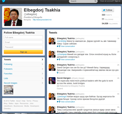 Өнөө маргаашгүй МУ-ын Ерөнхийлөгчийн сонгууль болох гэж байна. Хэн гэдэг эрхмүүд Монгол Улсын тэргүүний төлөө өрсөлдөх нь тодорхойгүй байгаа ч одоогийн Ерөхийлөгч улирахаар зүтгэх нь тодорхой. Эби ерөхийлөгч сонгуулийн “пиар”-аа ч аль хэдийнэ эхэлсэн. Олон арван хүмүүсийг одон медалиар шагнаад л, олимпийн медальтнууддаа цалин хөлс бодож өгөөд л, урьд өмнө нь сэтгэж байгаагүйгээрээ хууль энэ тэр санаачлаад л ёстой нэг “од” болж байгаа. Тэгвэл Ц.Элбэгдоржийн дараагийн нүүдэл нь ард түмнээ байлдан дагуулж “жиргэх” болоод байна. Уг нь Ерөнхийлөгч Ц.Элбэгдорж анхны жиргээчдийн нэг ч өөрөө төдийлэн жиргэдэггүй, албан мэдээллүүдээ хүргэдэг байсан санагдана. Харин одоо бол огт өөр болсон. Саяхнаас тун идэвхтэй жиргэж байгаа харагдана. Тэрээр “Миний Монголын жиргээчид ээ, шинэ долоо хоногийн мэнд, David Gergen гэж хэн бэ гэж үү? Миний багш. Харвардад багшилдаг юм. Амeрикийн 4 eрөнхийлөгчид зөвлөж явсан хүн дээ, Таны сонгуулиа өгөх эрхийг хүндэтгэж ажлын өдөр санал авна. Тэр өдрийн таны хамгийн чухал ажил бол сонгуульдаа оролцож саналаа өгөх, Таны сонголт дэлхийг өөрчлөхгүй ч Монголыг өөрчилөхөд нөлөөлнө. Ялангуяа орон нутгийн удирдлагыг өөрчлөх эс өөрчлөхөд, Би намаас тvдгэлзээд удаж бна. Тvмний telee зvтгэх сэтгэл байвал шинэ хуучин ялгаагvй болно доо.” гэх мэтээр жиргэдэг Ерөнхийлөгчийн хаяг 33,938 дагагчтай топ хаягуудын нэг болоод байгаа юм шүү.