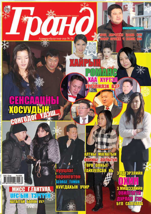 Дугаарт бүртээ папараци, сенсааци, шинэ содон мэдээлэл багтааж, даацтай, оюунлаг нийтлэлүүдээрээ салбартаа толгой цохидог “Гранд” сэтгүүлийн цоо шинэхэн дугаар худалдаанд гарлаа. Үлгэр домог мэт яригддаг мөнхийн залуу нас Э.Одгэрэлийн ганц охин Э.Мишээл, Даян аварга А.Сүхбатын залуу гэргий Н.Гарамханд нарыг “Гранд”-ынхан энэ удаад папарацийн дурандаа буулгажээ. Өдгөө 20 настай, Рояал академийн оюутан Э.Мишээлийн дурлал дөнгөж амьдралаа эхлүүлж байсан хосуудыг салгахад хүрээд байгаа тухай болон топ модель Э.Одгэрэлийн олонд дэлгэгдэж байгаагүй нууц хөрөнгө, нууцлаг амьдралыг дэлгэсэн нь тун сонирхолтой болжээ. Дархан аварга Х.Баянмөнхийн хайртай охин Б.Баясгалангаас өрх тусгаарлаагүй ч гимнастикчин залуу бүсгүйгээр өөрийгөө гоёх болсон А.Сүхбат аваргыг Н.Гарамханд гэргийтэй нь “Гранд” сэтгүүл анхлан дуранджээ. Мөн Монголын хөшигний ардах нууцлаг хөрөнгөтнүүдийн нэг “Хүннү коал”-ын Жорж Төмөр буюу Т.Лхагвадорж, түүний гэргий хэн болох, хэрхэн баяжсан талаар сонирхож байвал, экс ерөнхий сайд Сү.Батболдын ууган хүү Б.Баттүшигийн Америкт 6 тэрбумаар худалдаж авсан тансаг хауз, поп хатагтайг дийлэгч хэн болох, 20 саяын цалин авч, хоёр том цамхагт амьдрагч бүсгүйг хэн болох гээд тун ч сонирхолтой олон мэдээллийн хариултыг дараа дараагийн хуудаснаас авч болох нь ээ. Саяхан УИХ-ын гишүүн С.Ганбаатар, С.Баярцогт хоёрыг халз мэтгэлцээний рингэнд тулалдуулсан Оюутолгойн гэрээ, Рио Тинтогийн үнэн нүүр царай, бодит үнэнийг мэдэхийг хүсвэл “Гранд” энэ тухай тун ч сонирхолтой өнцгөөс нь бичсэн байна. Цаашилбал “Хайрын романс хаа хүртэл үргэлжлэх бол?” хэмээх нийтлэлдээ дээдсийн хүрээлэл гэгддэг их хурлын гишүүд, хөрөнгөтөн бизнесмэнүүдийн хайр дурлалын хэлхээ холбоо, одоо хэрхэн хаана өрнөж буйг сонирхолтойгоор нийтлүүлсэн нь таны сонирхлыг татах нь дамжиггүй. Тус сэтгүүлийн байнгын уншигчдын тэсэн ядан хүлээдэг ярилцлагын хойморт энэ удаад УДЭТ-ын найруулагч, алдарт Гамлетаар 11-р сард үзэгчдэд бэлэг барьсан Н.Наранбаатар уригдаж сонирхолтой, амттай яриа өрнүүлжээ. Энэ мэт шинэ жилээр ямар даашинз моод тодорхойлох хийгээд өнгөрсөн онд хэн хамгийн сайхан мөн хамгийн муухай хувцасласан талаар сонирхохыг хүсвэл энэ талаар “Гранд” мөн онцолжээ. Сард нэг удаа 76 нүүртэйгээр таны гар дээр очдог “Гранд” сэтгүүлийн 28 дахь дугаарыг та бүх супермаркетууд, ном сэтгүүл худалдааны цэгүүдээс худалдан авч унших боломжтой. Мөн нэмж дуулгахад тус сэтгүүлийн 2013 оны 1-р улирлын захиалга орон даяар бүх шуудангийн салбаруудаар явагдаж эхэлсэн тул та яаравчлан захиалж, “Гранд”-ын дугаар бүрийг алгасалгүй хав халуунаар нь уншиж байгаарай. Монгол шуудан, Скай пост, Улаанбаатар шуудан, Түгээмэл шуурхай шуудан зэрэг бүх шуудангийн салбарт та 12-р сарын дотор багтаж захиалгаа өгөөрэй.
