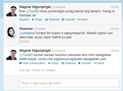 О.Магнай шиг “од” Монголд маш ховор. Хаана хүн амьтан, хүүхэн шууханы эрх зөрчигдөж байна, мань Магнай байж л байна. Асуудалгүй болсон. Амьдрал тэр чигээрээ О.Магнайгийн хараа хяналтан дор хөгжиж, дэвжиж байгаад магнай хагартал баярлах хүн олон. Юун нөгөө шударга Ерөнхийлөгч мантай. Магадгүй О.Магнайг Ерөнхийлөгчид үзвэл дэмжих хүн олон байх шүү. Энэ онд тэнгэрээс буусан элч нь тэр О.Магнай гээд л хүмүүсийн хандлага түүнлүү чиглэсэн. Сүүлдээ бүр охид бүсгүйчүүд ч түүнийг зүгээр байлгахаа больсон гэнэ лээ. Мань хүний твиттер хуудас ч бөөн ачаалал байдаг сурагтай байсан. Тэгтэл О.Магнайг бус О.Магнай өөрөө охидыг өдөж суудаг юм биш үү гэж бодлоо. Яагаад гээч... та доорх твиттер хуудсыг хар.