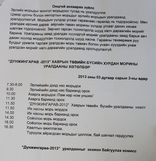 Монголын Морин Спорт Уяачдын Холбооны санал санаачлагын дагуу Засгийн Газрын шийдвэрээр зохион байгуулагддаг “Дүнжингарав-2013” төвийн бүсийн хурдан морьдын хаврын уралдаан ирэх сарын 3-нд Хүй долоон худгийн Цагаан хөтөлд зохион байгуулагдах талаар дөнгөж ММСУХ-ноос мэдээлэл хийлээ. Эх орны өнцөг булан бүрээс цугларсан газар газрын алтан туурт хүлгийн энэхүү уралдаанд их нас, азарга, соёолон, эрлийзийн дээд нас гэсэн дөрвөн насны ангилаар уралдах бөгөөд бүртгэл Өлзийт хорооллын 59-р сургууль дээр 3 сарын 2-нд явагдах юм байна. Мөн бүртгэлийн үеэр хурдан морь унаач хүүхдүүдийг даатгалд хамруулах бөгөөд ММСУХ-ноос иж бүрэн хувцас хэрэглэлээр үнэ төлбөргүй хангах гэнэ. Харин бай шагналын хувьд Засгийн газрын шийдвэрээр зохион байгуулагдаж буйтай холбоотойгоор Улсын баяр наадмын бай шагналын дагуу түрүү морь таван саяаас эхлэх аж.