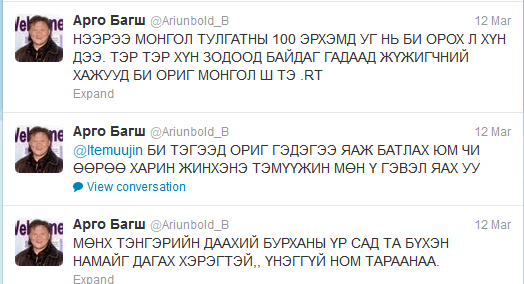 Аймаар олон хэлтэй хүн Монголд ганцхан байдаг нь Арго багш. Дэлхийн 25 хэл, дээрээс нь тэнгэртэй ярьдаг хэлээ нэмчихвэл 26 хэлээр ус цас шиг ярьдаг гэх. Хэр баргийн хүний толгой гүйцэхээргүй олон хэлээр “ярьдаг” түүнийг мэдлэгтэй гэхээсээ илүү “мэдрэл” хэмээн нэрийдэх хүмүүс олон. Бүр телевизээр гарах, ном үйлдвэрлэх хоёр дээрээ хэнийг ч дагуулахгүй тэрээр нэгэнтээ Боловсролын яамны хийх ёстой ажлыг би сайн дураараа хийж байна, төр надад мөнгө өгвөл таарна гэж байсан удаатай. Юутай ч "Ард түмний гавъяат" гэх албан бус цол, хэргэмтэй Арго багш саяхан твиттэр хуудсандаа өөрийгөө ихэд өргөмжилөөд авав. Тэрээр “Кинон дээр хүн зодоод байдаг тэр хүний оронд би л жинхэнэ "Монгол тулгатны 100-н эрхэм"-д орох ёстой жинхэнэ ориг монгол хүн" хэмээн жиргэсэн юм.