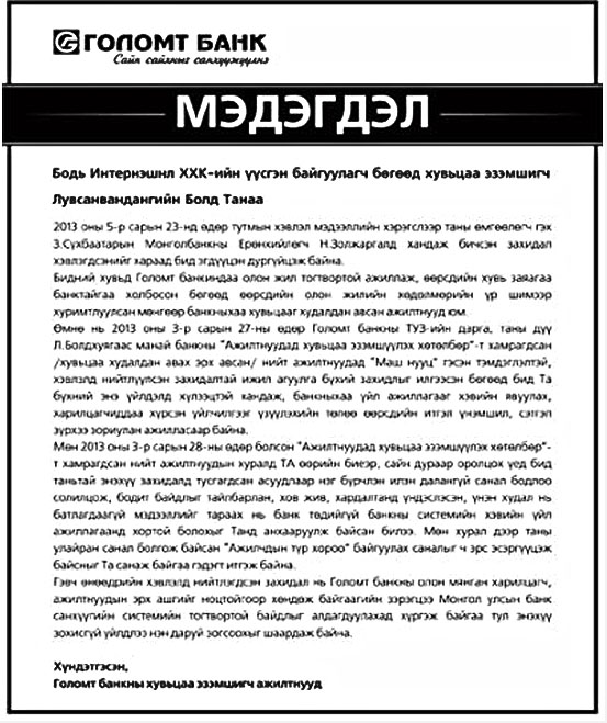 ”Голомт” банкны удирдлагууда Л.Болдод хандаж мэдэгдлийг гаргажээ. 2013/05/24 11:56 Coolpic "Голомт" банкны удирдлагуудаас тус банкны хувьцаа эзэмшигч болох Л.Болдод хандаж дараах мэдэгдлийг гаргажээ. АНХААРУУЛГА: Уншигчдын бичсэн сэтгэгдэлд www.grandnews.mn хариуцлага хүлээхгүй болно. Манай сайт ХХЗХ-ны журмын дагуу зүй зохисгүй зарим үг, хэллэгийг хязгаарласан тул Та сэтгэгдэл бичихдээ бусдын эрх ашгийг хүндэтгэн үзнэ үү. Илгээх Сэтгэгдэл байхгүй байна Golomt Ene bank butehgui ee, erthen mungunuudee abtsgaa 2013 оны 05 сарын 24 | Хариулах hariltsagch ivaa asuudald uuriin uhamsraa hyanah chadvartai bgaa gej naidaj bn ta uuriin erh ashigaas iluu olon jil hariltsagch yavsan mani hediigee hulduu chirehgui bh gej niadaj bn odoo tanaihaas munguu avaad ergeed uur gazar bairshuulah ene ter ajild tsagaa urj nervtmeergui bn bitgii setgel sanaa stresseer daajignaachee bas hamaatnii huuhed maani tanaid ajildag huurhii ar geree tejeej yadaj bgaa amitniig ajilgui bolchihvii gej aij bn nad shig bodoltoi olon hun bgaa bh 2013 оны 05 сарын 24 | Хариулах × < >
