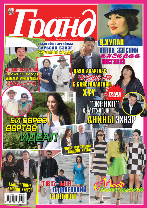 Монгол түмэн төрийн тэргүүнээ сонгох түүхэн цаг мөчтэй зэрэгцэн үндэсний их баяр наадам хаяанд ирсэн хуртай, нартай зуны энэ өдрүүдэд олон сонирхолтой мэдээ материалаар баялаг “Гранд” сэтгүүлийн 35 дахь дугаар таны өмнө хуудсаа дэлгэж байна. Юуны өмнө наадмын гоёл сэлтээ базааж амжаагүй уншигчиддаа зориулж өнгөрсөн жилийн баяр наадмын олны танил эрхмүүдийн үндэсний гоёлыг хүргэж буйг дуулгахад таатай байна. Таны загварын сонголтонд тус нэмэр болох биз ээ. Байнгын уншигчдын ширээний хэвлэл болсон тус сэтгүүлийн шинэхэн дугаарт нэгэн цагт ИЗНН-ын лидерээр тодорхойлогдож, Ерөнхийлөгчийн сонгуульд нэр дэвшиж явсан Л.Дашням ноёнтны хүргэнүүд болох ЭМ-ийн экс сайд Н.Хүрэлбаатар, “Стандарт” группийн захирал Д.Батаа нарыг онцолжээ. Мөн сангийн сайд сандлыг эзэгнэх заяатай төрсөн Ч.Улааны залуу гэргий болоод 1000 нэрийн барааг эзэгнэгч шинэхэн хадмуудыг нь танд танилцуулах юм. Папараци дурандаа үндэсний бөхийн үүх түүхийг удам дамжин бичилцэж яваа даян аварга А.Сүхбатын анхны гэргий Б.Баясгалангийн ууган хүү буюу Д.Хишигдорж зааны нууц хүүг онилсон байна. Нэгэн цагт хар шилний цаана нуугдаж, хөшигний ард амьдарч явсан ноён Женкогийн амьдрал, намтар улс төрд орж ирснээр олонд дэлгэгдсэн.