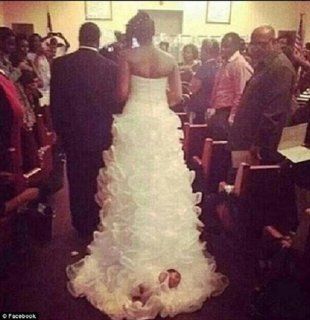 Түүний Vera Wing –ийн цагаан даашинз бяцхан охиныг байрлуулах тусгай бэхэлгээтэй байсан нь энэ бүхнийг анхнаасаа төлөвлөсөн байсныг гэрчилж байгаа юм. Зочдын дунд энэ үйлдлийг ямар нэг асуудалгүй хэмээн үзсэн нэг хүн байсан нь сүйт бүсгүйн найз юм. Тэрээр найзынхаа цахим хуудсанд хурим үнэхээр гайхалтай болсон тухай бичиж үлдээжээ. Гэсэн ч энэхүү зурагнаас та бүхэн хүүхдээ чирч явааг гайхан харах зочдыг харж байгаа байх.
