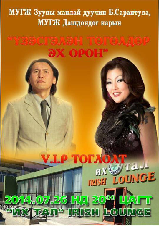 “Хөх тэнгэр”-ийн Дашка буюу МУГЖ Б.Дашдондогийг чадалтай хоолойтой гэдэгтэй хэн ч маргахгүй биз ээ. Хувь уран бүтээл гэхээсээ илүүтэй дуучид, студийнхаа ажилд харцуй шамласан түүний “Nature sound”-аас цөөнгүй шинэ залуу уран бүтээлчид мэндэлсэн. Тэрбээр дуулах дур сонирхолтой авьяаслаг залуусыг урлагийн замд хөтлөж яваа нэгэн. Тэгвэл Дашка Зууны манлай дуучин Б.Сарантуяатай хамтран энэ сарын 26-нд ганцхан удаа “Үзэсгэлэнт төгөлдөр эх орон” нэртэй VIP тоглолтоо хийхээр болжээ.