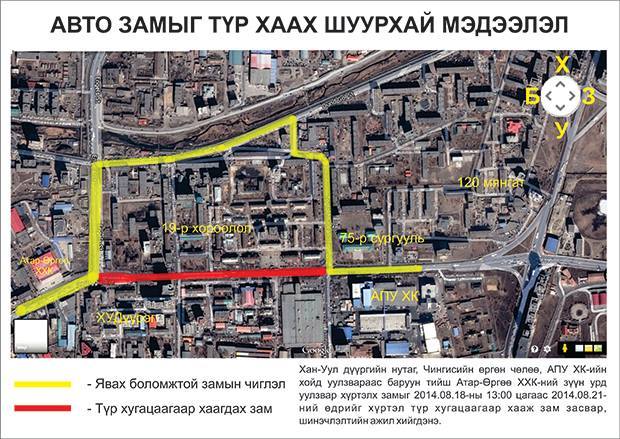 Хан-Уул дүүргийн Засаг даргын тамгын газрын арын замыг өчигдрөөс эхлэн хаалаа. Энэ замыг “Гудамж” төслийн хүрээнд өргөтгөн шинэчилж байгаа юм байна. Тиймээс Чингисийн өргөн чөлөөний гудамж буюу АПУ-гийн арын уулзвараас “Атар Өргөө” ХК хүртэлх замын хөдөлгөөн энэ сарын 21-н хүртэл хаалттай гэсэн үг. Энэ хэсгийн замыг өргөтгөж, хатуу хучилт хийх ажээ. Хөдөлгөөн ихтэй энэ замыг хаасан тул тухайн чиглэлд тээврийн хэрэгслээр зорчигчид нээлттэй замуудыг сонгон зорчих хэрэгтэйг албаныхан сануулжээ. Тухайлбал XIX хорооллын арын замыг сонгох, Нарны гүүрээр давах зэрэг зохицуулалтыг хийж болох ажээ.