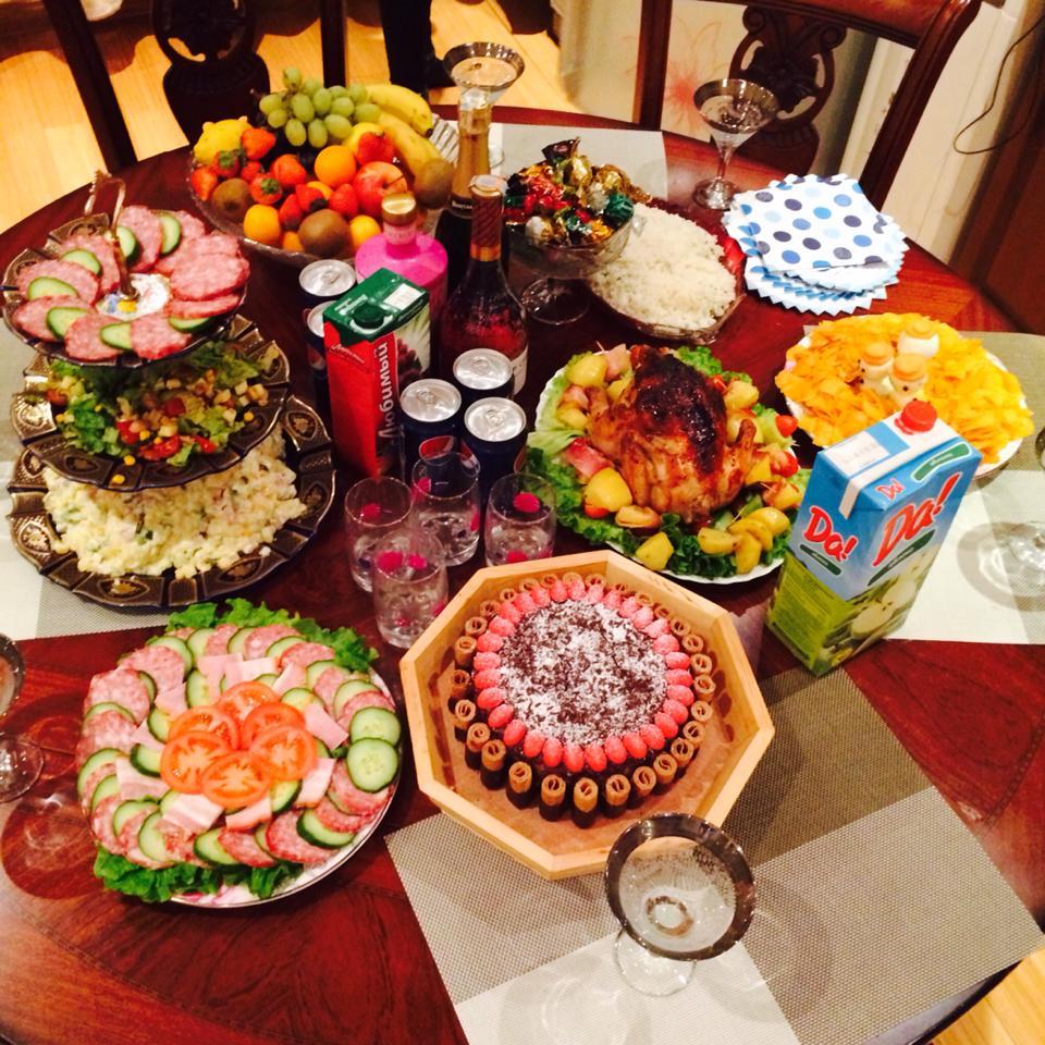 Шинэ жилээр хүн бүхэн шинэ жилийн вандуй идэх ёстой. Он солигдох мөчид хүйтэн зууш, төмсний салат хийдэг. Зарим нутагт шинэ жилээр хүн 7 янзын, эсвэл 9 янзын зууш идэх ёстой гэж үздэг. Баярын ширээнд шарсан гахай, чанасан будаа, вандуй, шош, загасны түрс, намуу цэцгийн үр тавьж чимдэг. Мөн хун шувуу, бурхан, үлгэрийн баатруудын дүрстэй талх хийж тавина. Жигнэмэг, халуун ундаа хэрэглэнэ.