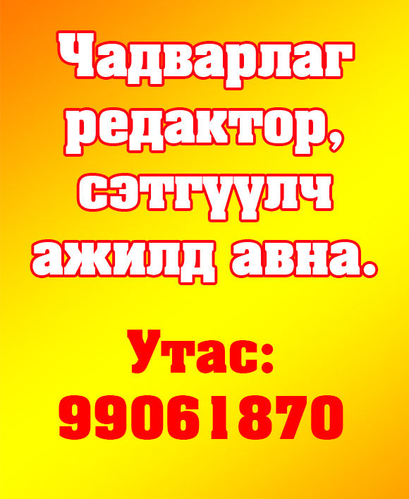 Чадварлаг редактор, сэтгүүлч ажилд авна. 2015/01/27 11:37 Coolpic АНХААРУУЛГА: Уншигчдын бичсэн сэтгэгдэлд www.grandnews.mn хариуцлага хүлээхгүй болно. Манай сайт ХХЗХ-ны журмын дагуу зүй зохисгүй зарим үг, хэллэгийг хязгаарласан тул Та сэтгэгдэл бичихдээ бусдын эрх ашгийг хүндэтгэн үзнэ үү. Илгээх Сэтгэгдэл байхгүй байна × < >