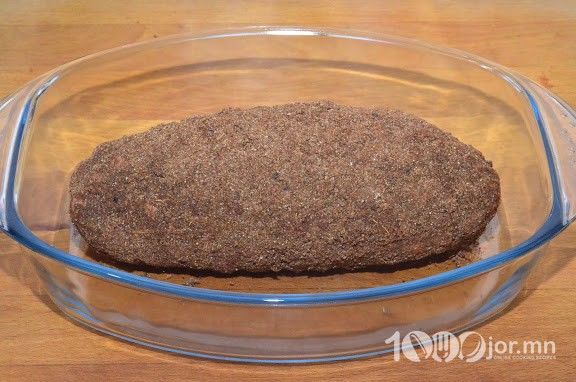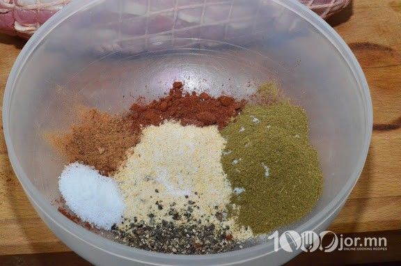 · Шарах шүүгээг 180С хэмд халааж бэлтгэх ба дээрх амтлагчуудыг саванд хийж сайтар холиорой. Гахайн ясгүй гол мах бэлтгэнэ.