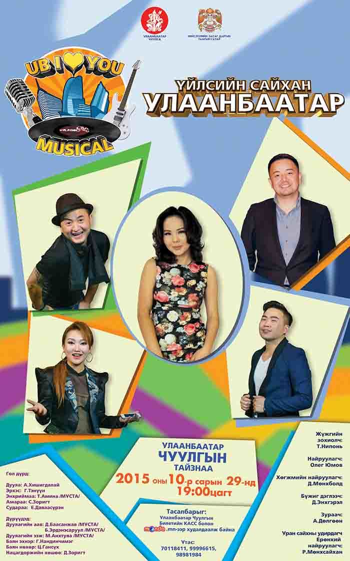 “Үйлсийн сайхан Улаанбаатар” буюу “UB I love you” мюзиклыг 2015.10.29-ний Пүрэв гарагийн 19:00 цагт Улаанбаатар чуулгын тайзнаа ганцхан удаа тоглоно. Тасалбарыг Улаанбаатар чуулгын билетийн касс болон https://www.monda.mn/#host/6сайтаас авах боломжтой.