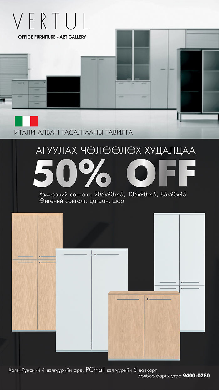 Шинэ жилийн баярыг тохиолдуулан бид бүх албан тасалгааны тавилгандаа 50% хямдрал зарласан байгаа тул хэрэглэгч та яараарай.
