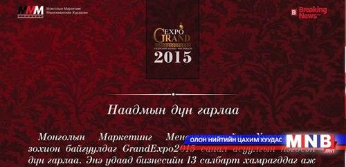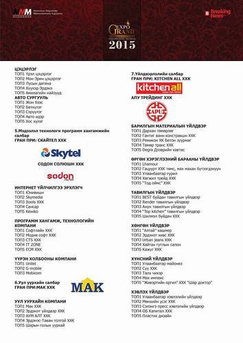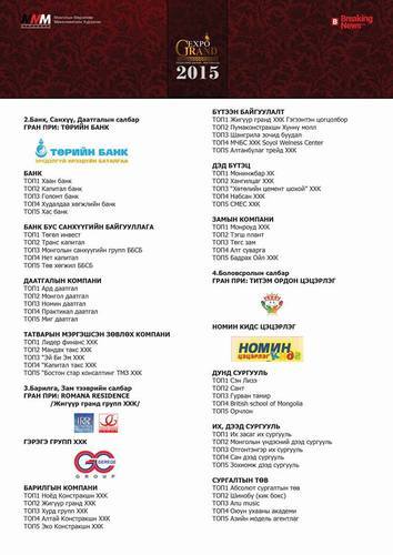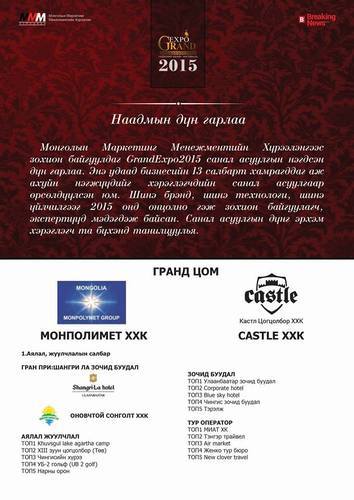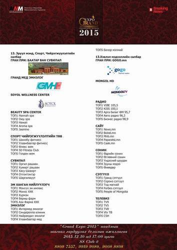 Монголын Маркетинг Менежментийн Хүрээлэнгээс зохион байгуулдаг "GrandExpo-2015" санал асуулгын нэгдсэн дүн гарлаа. Энэ удаад бизнесийн 13 салбарт хамрагддаг аж ахуйн нэгжүүдийг хэрэглэгчдийн санал асуулгаар өрсөлдүүлсэн юм.