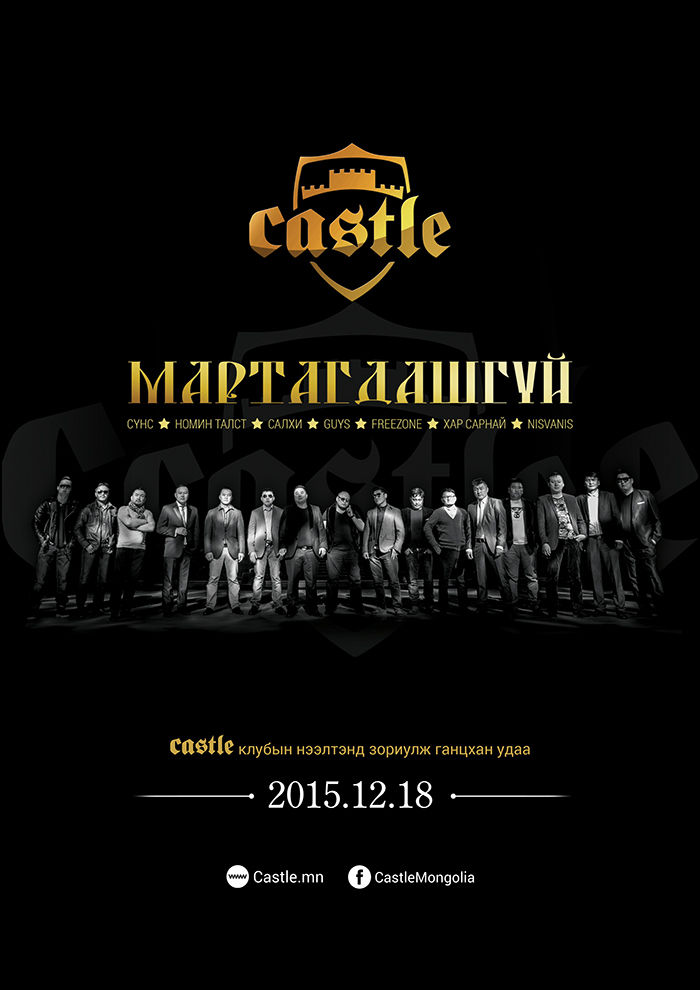 Монголын рок поп урлагийн шилдэг эрэгтэй таван хамтлагийн хамтарсан «Мартагдашгүй» тоглолт өнгөрсөн 10-р сарын 09-нд Улаанбаатар паласын их танхимд гайхалтай болж залуусын талархлыг ихэд хүлээсэн билээ. Тэгвэл тус тоглолт хүрээгээ улам тэлж «Сүнс», «Номин талст», «Салхи», «Guys», “Freezone”, “Хар сарнай”, “Нисванис” зэрэг нэгэн үеийн долоон хамтлагийн бүрэлдэхүүнтэйгээр энэ сарын 18-нд дахин тоглож сонсогч фенүүддээ дурсамж дүүрэн «Мартагдашгүй» үдшийг бэлэглэхээр болжээ. Дэлхийн дээд зэрэглэлийн клубуудын стандартаар Монголд анх удаа байгуулагдаж буй “CASTLE” клубын нээлтэнд зориулан тоглох “VIP” тоглолтонд долоон хамтлагийн залуус маань өөр өөрсдийн үе үеийн хит дуунуудаараа үзэгчдийн сонорыг мялааж, дурсамжийг сэргээн хамтдаа дуулж бүжиглэж нэгэн оройг гайхалтай өнгөрүүлэх нь ээ. Өнгөрсөн сарын тоглолтыг үзэж амжаагүй олон залуусын хүслийг биелүүлсэн «Мартагдашгүй» тоглолт дахин тавигдах гэж буй мэдээ арванхоёрдугаар сарын шуугиан болж байна.