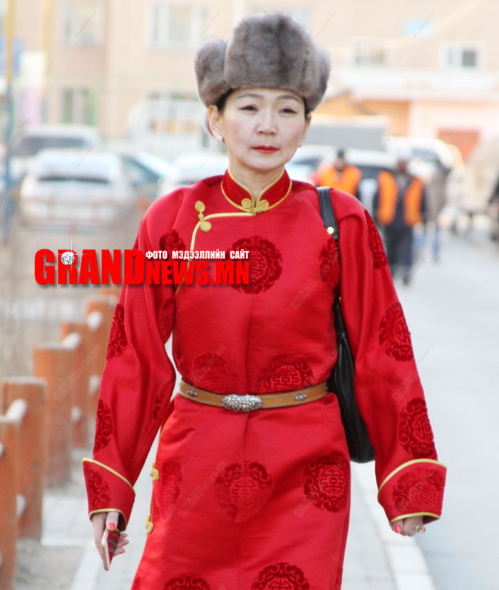 Түүний цагаан сарын гоёл улаан үүтэн хуаран дээл, дөрвөн талт саарал булган малгай байв. Үндэсний хувцасан дээр мэдрэмжтэй сонголт хийж чадвал европ загварын дэгжин өндөр өсгийт ч сайхан харагдаггийн жишээ энэ дээ.